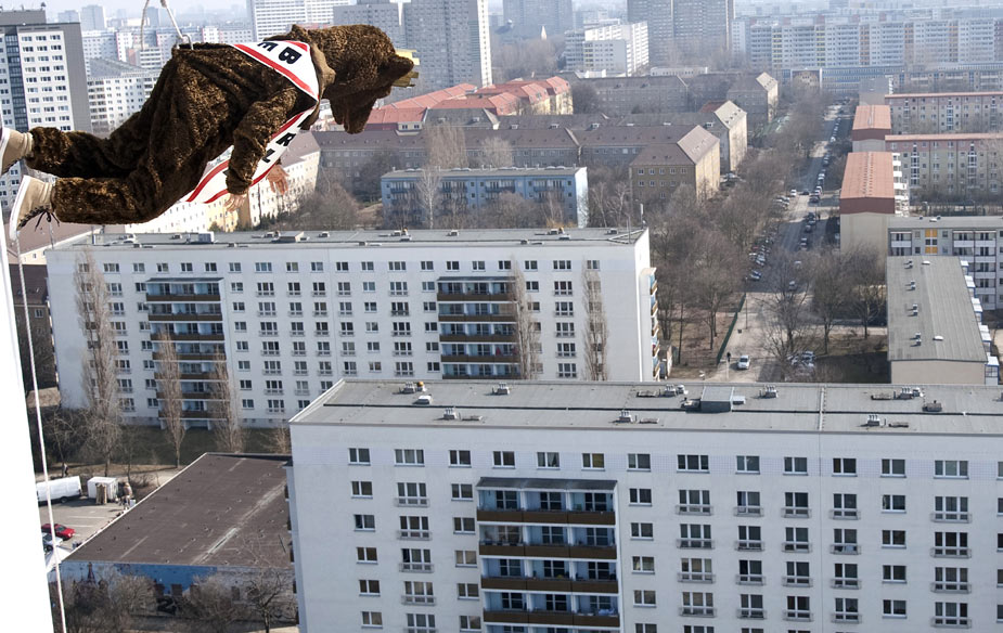 3月18日,在德國柏林舉行的“高樓漫步”活動中,一名女子打扮成熊的模樣(柏林的象征)在天使酒店外墻上行走,參加活動的人都有繩索保護。