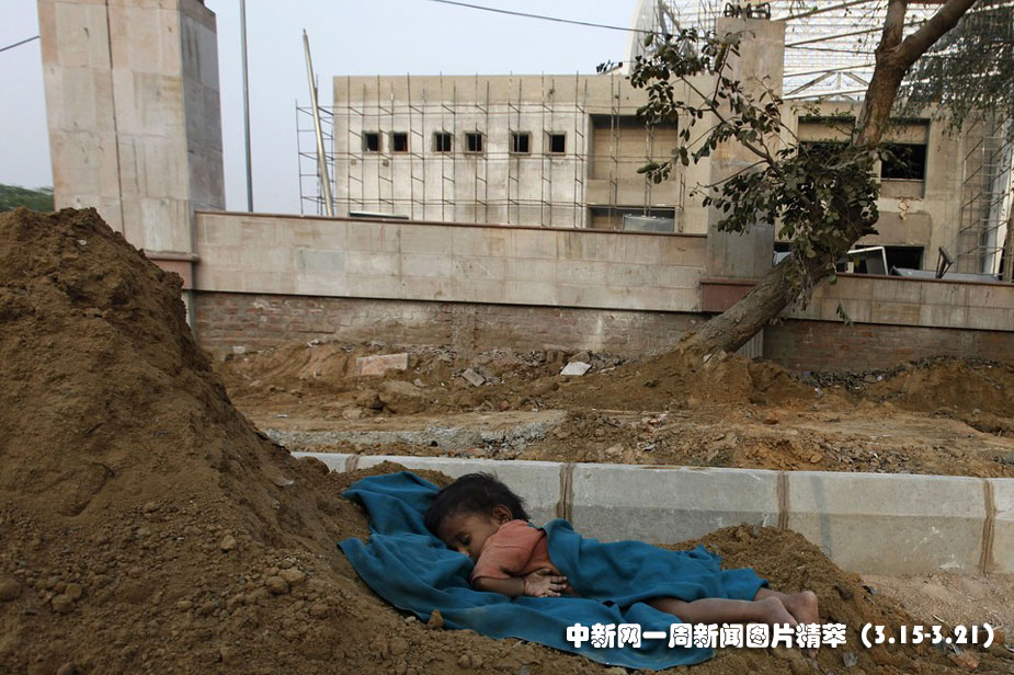 18日(周四),印度新德里,一個孩子在英聯(lián)邦運(yùn)動會體育場外的工地上睡覺。