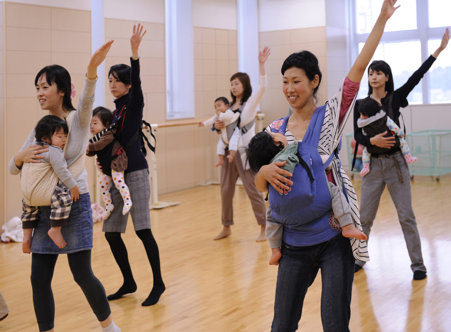 3月24日,在日本橫濱市的一堂母嬰桑巴課上,媽媽們帶著自己的寶寶一起參加舞蹈訓練。 凡是孩子年齡在三個月到兩歲之間的母親都可以到這里參加母嬰舞蹈課,課程包括桑巴、華爾茲、布魯斯等。