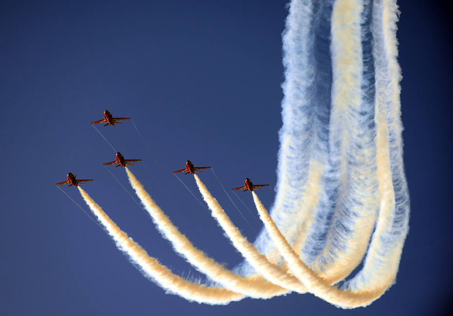 圖為英國“紅箭”特技飛行隊訓(xùn)練的資料圖片。