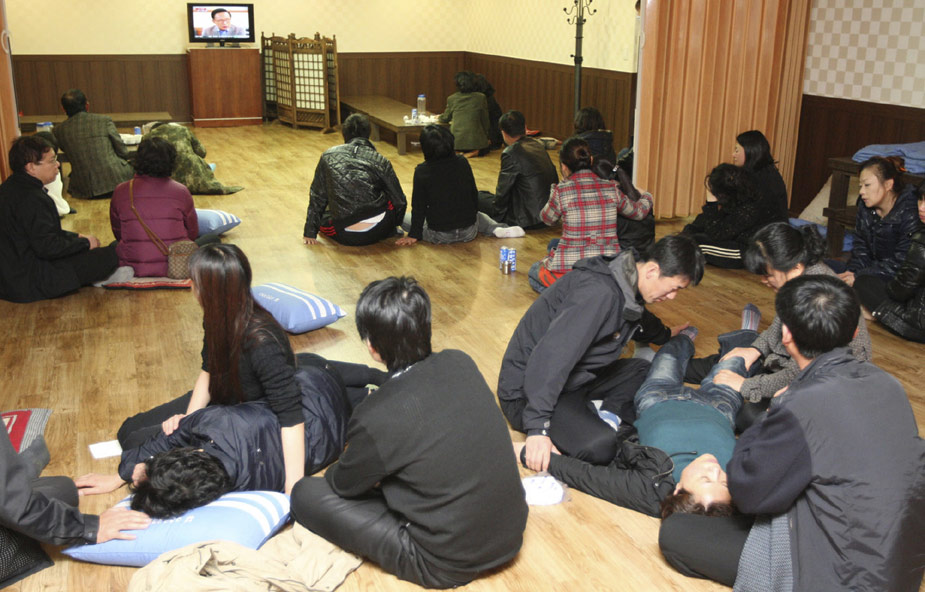 首爾當(dāng)?shù)貢r間26日晚9點45分許,在韓國西部海域執(zhí)行警戒任務(wù)的天安艦(1200噸級)因不明原因事故,船底被炸開洞,船尾開始下沉。天安艦上共有104人,韓國巡邏艇和直升飛機(jī)迅速展開救援行動,事發(fā)5小時后,官員稱已救出58人,但因為強(qiáng)風(fēng)和夜幕,救援行動進(jìn)展緩慢,其它人員仍下落不明。圖為韓國海軍“天安艦”上士兵的家屬正圍在電視前等待消息。