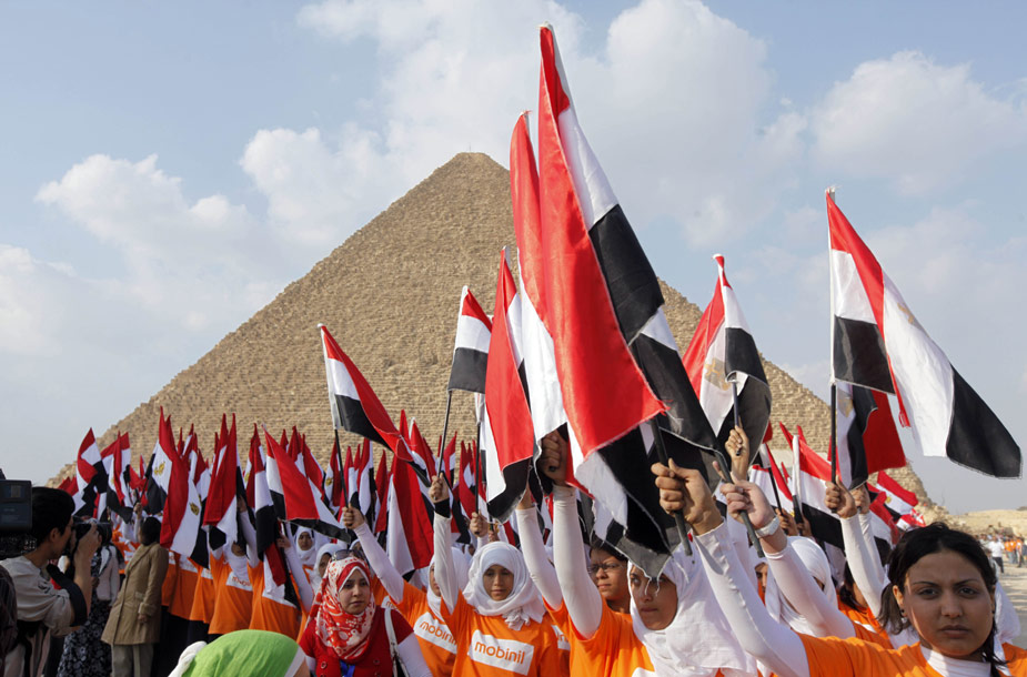3月26日,4550名埃及兒童在首都開羅市郊的胡夫金字塔前揮舞埃及國旗,創(chuàng)造了在同一地點集體揮舞國旗的吉尼斯世界紀錄。