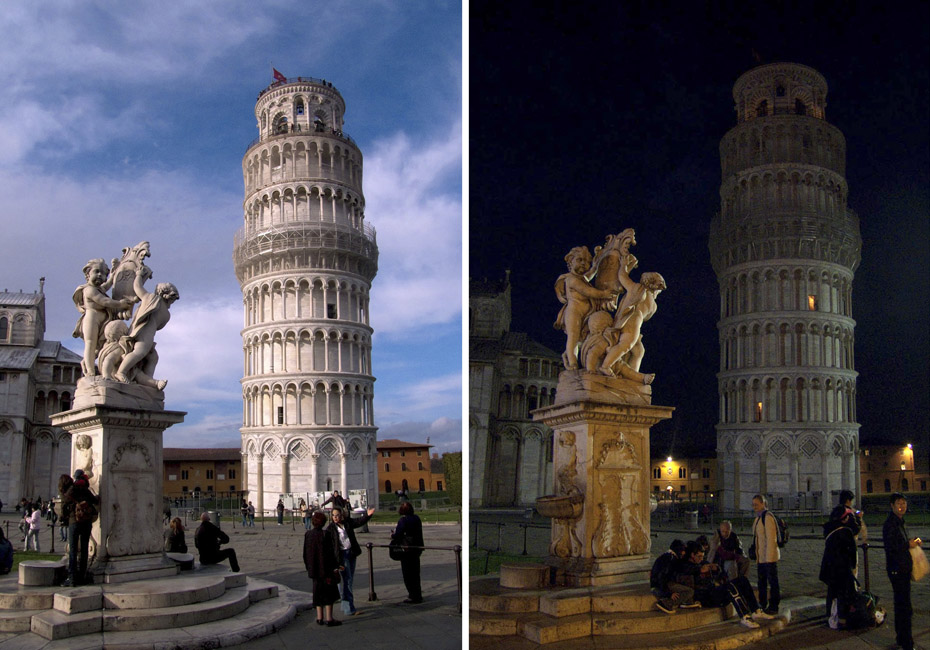 由世界自然基金會發(fā)起的“地球一小時”環(huán);顒27日20點30分按照時區(qū)依次在全球數(shù)千個城市展開。圖為意大利比薩斜塔在熄燈前和熄燈后的景色。