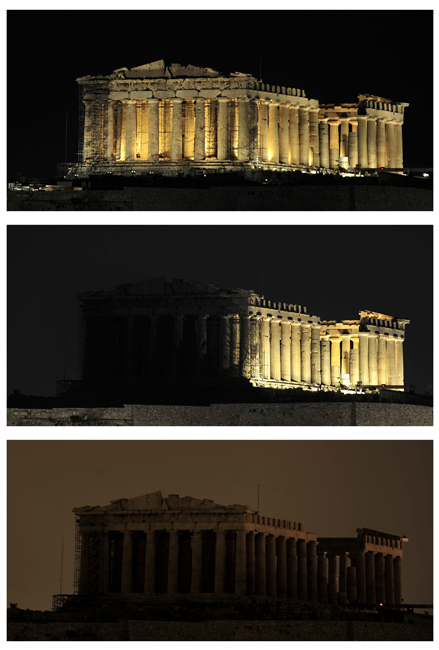 由世界自然基金會(huì)發(fā)起的“地球一小時(shí)”環(huán)保活動(dòng)27日20點(diǎn)30分按照時(shí)區(qū)依次在全球數(shù)千個(gè)城市展開(kāi)。圖為希臘帕特農(nóng)神廟在熄燈前和熄燈后的景色。