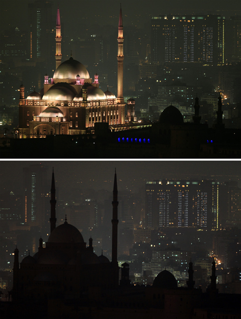 由世界自然基金會發(fā)起的“地球一小時”環(huán);顒27日20點30分按照時區(qū)依次在全球數(shù)千個城市展開。圖為埃及伊斯蘭教清真寺在熄燈前和熄燈后的景色。