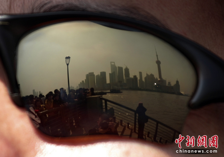 一個(gè)戴太陽(yáng)眼鏡的外國(guó)游客,參觀上海外灘。