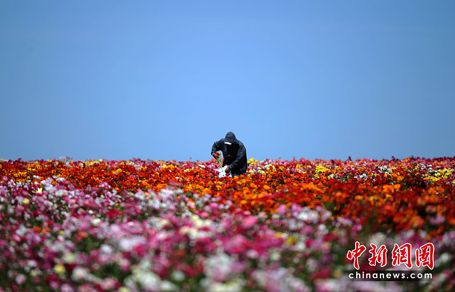 美國加利福尼亞州圣迭戈的卡爾斯巴德花田近日繁花盛開,姹紫嫣紅的花朵整齊地鋪滿在五十英畝的土地上,一望無垠的花海,美不勝收。圖片來源:中國新聞網(wǎng)