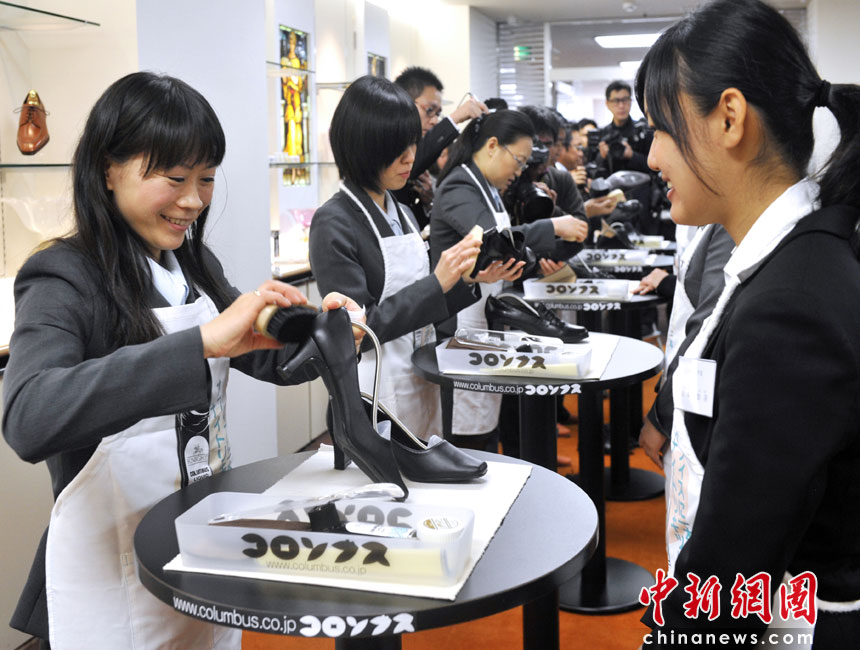 4月1日,日本一家鞋油廠新員工在入職儀式上為老員工擦鞋。圖片來源:中國新聞網(wǎng)