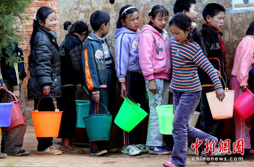 2010年3月31日,云南尋甸縣河口鄉(xiāng)白石巖小學(xué)里,一個老師站在水井前控制水量,一個學(xué)生5公斤水——這是一天的生活用水。