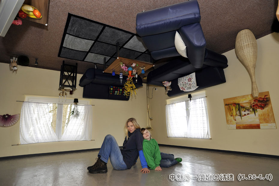 3月30日,德國蓋托夫市“瘋狂的房子”面向公眾開放。該房屋整個(gè)顛倒里面的家具也是被釘在屋頂上的。圖片來源:中國新聞網(wǎng)>>點(diǎn)擊觀看詳細(xì)內(nèi)容