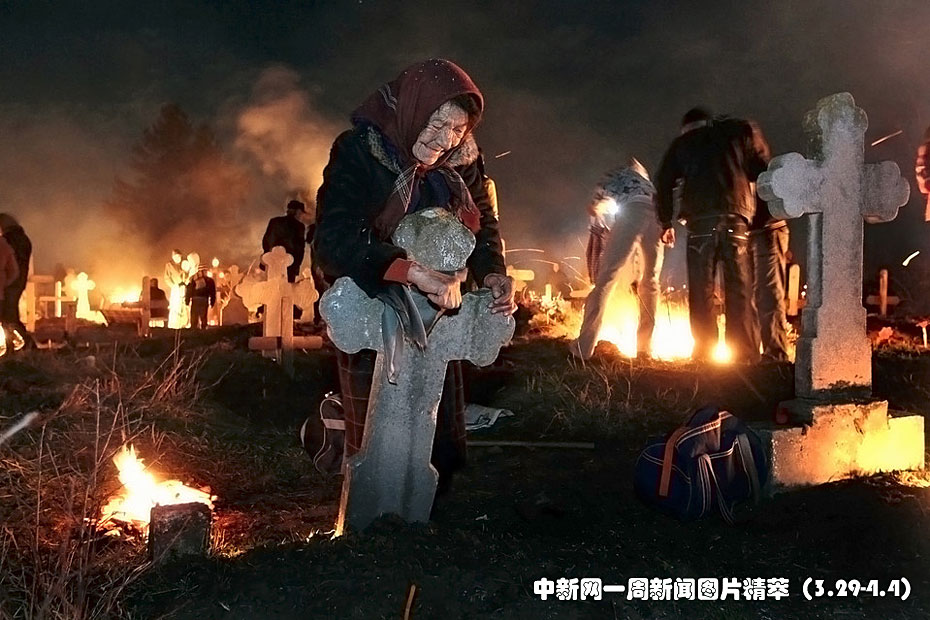 周四(1日),在羅馬尼亞弗魯穆沙尼(Frumusani)的棕枝主日(Palm Sunday)上,人們?cè)谀沟乩锶计鸹鹧妫I(xiàn)祭食物來(lái)悼念他們已故的親人。圖中,一位老婦倚靠在一塊十字形石碑上悼念埋藏在此的親人。