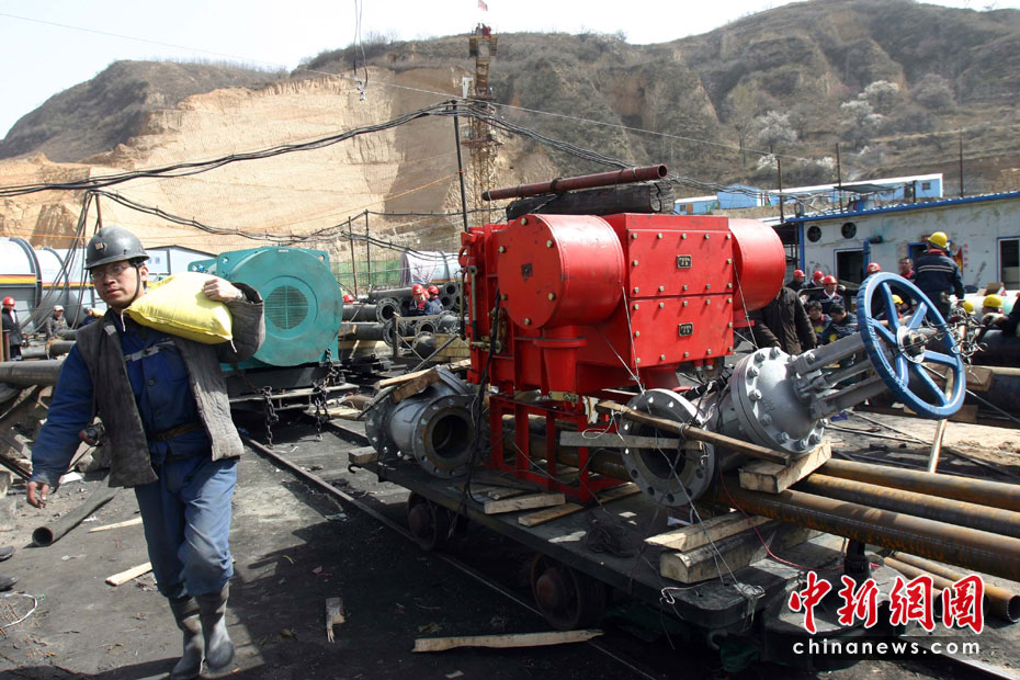 4月1日,“3·28”山西王家?guī)X透水事故進入第五天,由于排水進度緩慢,搜救人員還無法下井施救。圖為即將運送井下安裝的排水設備。中新社發(fā) 張云 攝