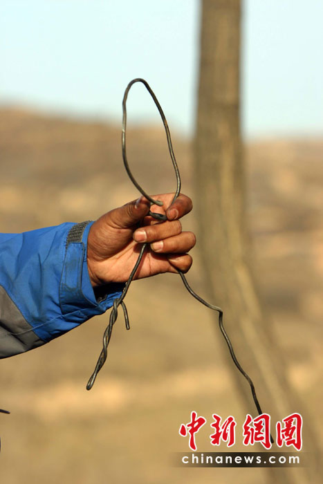 4月2日下午,華晉焦煤公司王家?guī)X礦透水事故搶險人員為井下有生命跡象的2號垂直鉆孔輸送營養(yǎng)液,并靜聽井下人員反饋回音。圖為2號垂直鉆孔鉆桿頭抽出時,鉆桿頭上綁著帶來生命跡象的鐵絲。中新社發(fā) 張云 攝