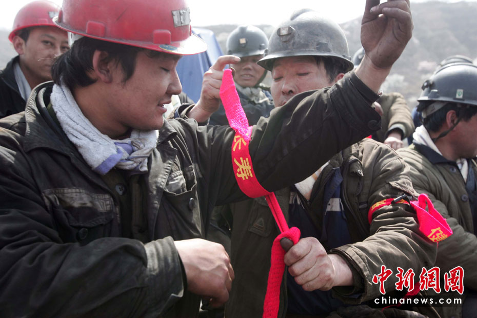 4月4日,華晉焦煤公司王家?guī)X礦透水事故第八天,搶險(xiǎn)指揮部組成120人的救援大隊(duì)下井,他們將在井下對獲救礦工進(jìn)行緊急救援。圖為救援人員在胳膊上綁著象征長壽平安的紅腰帶。中新社發(fā) 張?jiān)?攝