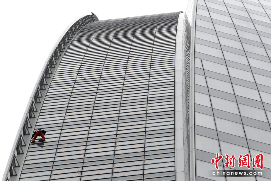 4月7日,巴黎,法國“蜘蛛人”羅伯特當(dāng)日用了大約50分鐘成功攀爬185米高的法國燃氣蘇伊士集團大樓。 圖片來源:中國新聞網(wǎng)