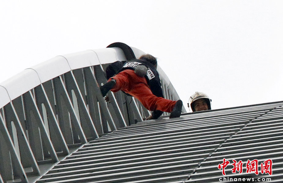 4月7日,巴黎,法國(guó)“蜘蛛人”羅伯特當(dāng)日用了大約50分鐘成功攀爬185米高的法國(guó)燃?xì)馓K伊士集團(tuán)大樓。