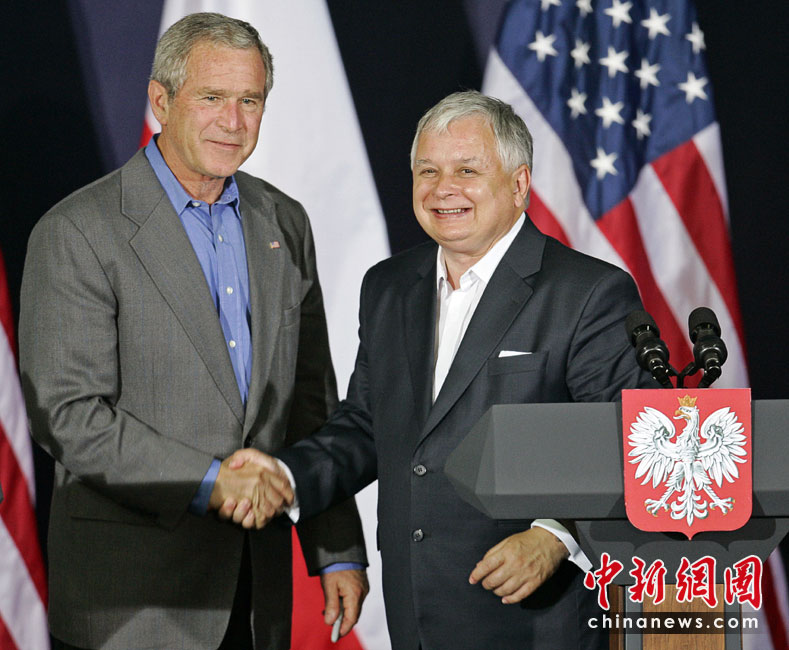 波蘭總統(tǒng)卡欽斯基乘坐的一架圖-154飛機10日在俄羅斯斯摩棱斯克州北部一軍用機場降落時失事,至少87人死亡。卡欽斯基本人被確認身亡。圖為2007年波蘭總統(tǒng)卡欽斯基與美國前總統(tǒng)小布什。