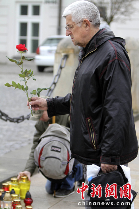 圖為波蘭華沙總統(tǒng)府前,有民眾拿著鮮花悼念身亡的總統(tǒng)。波蘭總統(tǒng)卡欽斯基乘坐的飛機10日在俄斯摩棱斯克失事,波蘭總統(tǒng)卡欽斯基已經確認死亡。有報道稱,飛機可能是在降落時被樹剮到,沒能在跑道上落地而墜落。不過亦有俄羅斯安全部門消息人士稱,人為失誤可能是造成波蘭總統(tǒng)專機墜毀的最主要原因。
