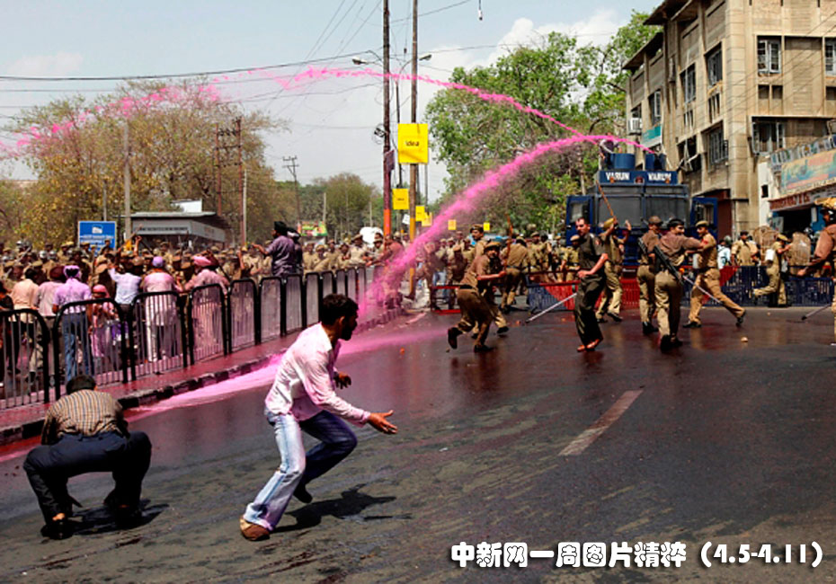 4月5日周一,尋求更多權(quán)利的難民在印度查謨街頭舉行抗議,印度警察動用高壓水槍驅(qū)散人權(quán),這些水槍噴出的是粉色水柱。