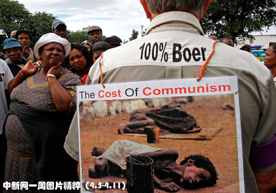 4月6日周二,在南非小鎮(zhèn)文特斯多,被害“白人至上”領(lǐng)導(dǎo)人尤金•特雷布蘭奇的一名支持者(圖右,背對(duì)鏡頭者)站在法院門(mén)外對(duì)人群講話(huà)。