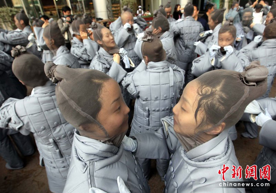 4月10日,由西安旅游局承辦的兵馬俑牽手上海世博會(huì)大型旅游宣傳咨詢活動(dòng)舉行。來自兵馬俑故鄉(xiāng)的百人表演隊(duì)伍,身著灰色的兵馬俑服裝,以鏗鏘的節(jié)奏、雄壯的氣勢(shì),在上海南京東路步行街和東方明珠廣場(chǎng)游演,吸引了大批市民及海內(nèi)外游客駐足觀看。文音/CFP