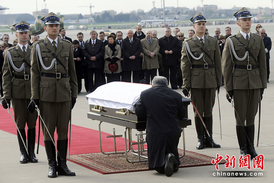 4月10日,卡欽斯基乘坐專機(jī)從華沙飛往俄羅斯斯摩棱斯克市,參加卡廷森林事件70周年紀(jì)念活動。途中飛機(jī)在斯摩棱斯克“北方”軍用機(jī)場附近降落時失事,共造成包括卡欽斯基夫婦及眾多政府高官在內(nèi)的96人死亡。慘劇發(fā)生后,舉世震驚。圖為卡欽斯基的孿生兄弟在遺體前跪拜。