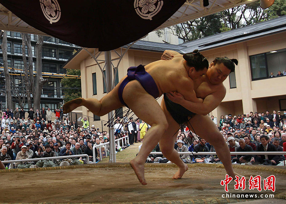 4月9日,來自世界各地的相撲選手齊聚日本東京靖國神社內(nèi)的相撲館參加為期一天的日本供奉大相撲比賽。圖片來源:中國新聞網(wǎng)