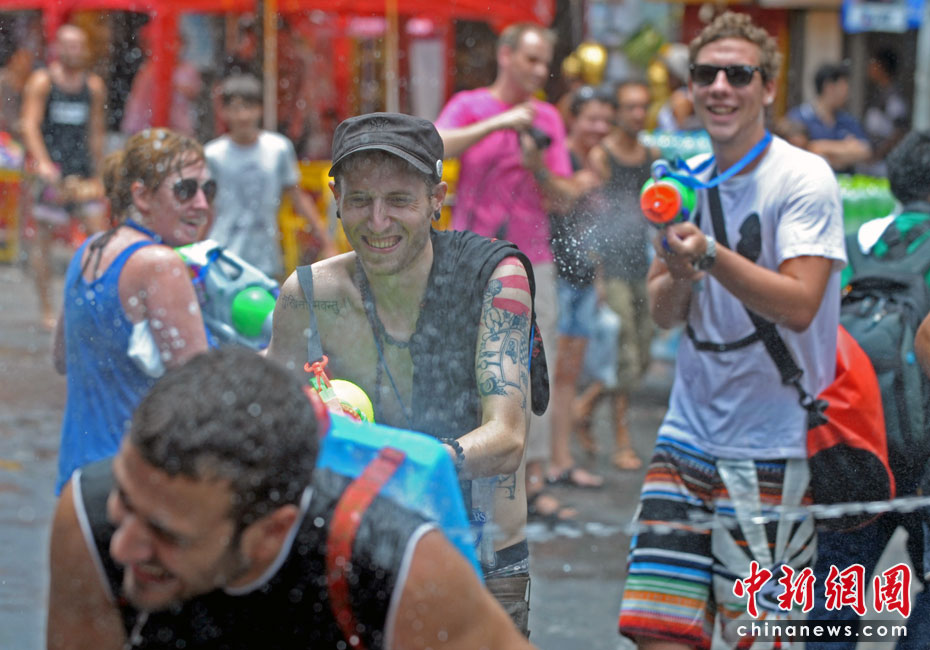 4月12日,泰國迎來一年一度的潑水節(jié),在拷桑路旅游區(qū)人們用水槍與大象“互噴”希望為對方送上祝福同時(shí)慶祝泰國新年。圖片來源:中國新聞網(wǎng)