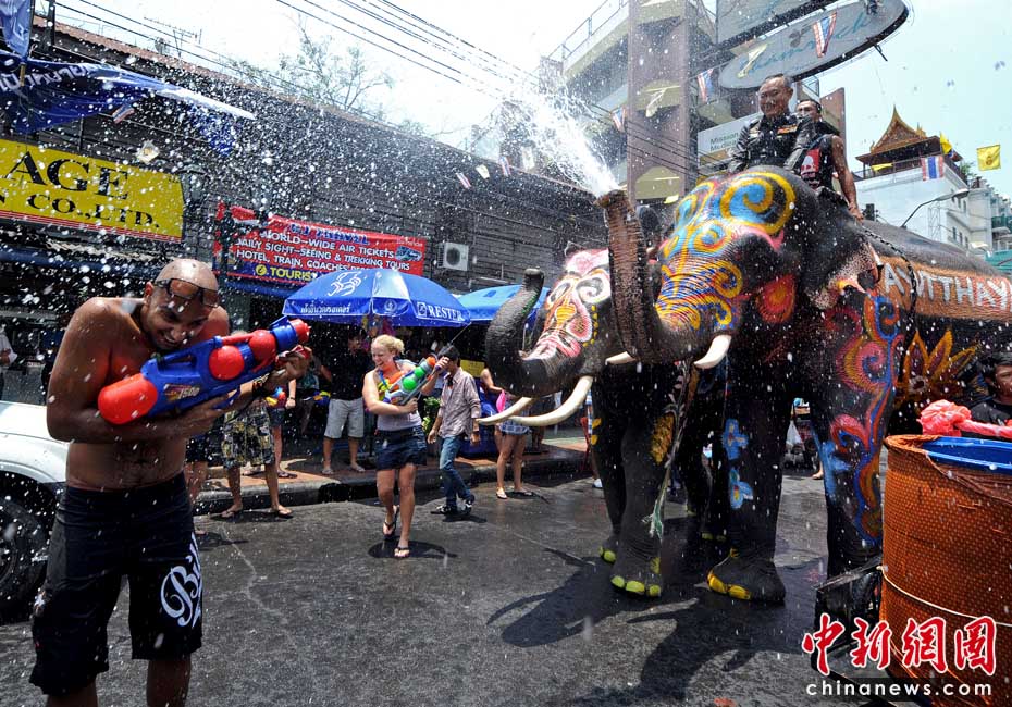 4月12日,泰國(guó)迎來(lái)一年一度的潑水節(jié),在拷桑路旅游區(qū)人們用水槍與大象“互噴”希望為對(duì)方送上祝福同時(shí)慶祝泰國(guó)新年。圖片來(lái)源:中國(guó)新聞網(wǎng)