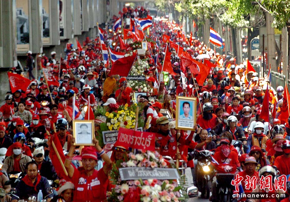 當?shù)貢r間4月12日,泰國紅衫軍在曼谷市區(qū)抬著棺材舉行游行,借此向政府施壓促阿披實下臺。此前紅衫軍示威者與軍警發(fā)生沖突,造成21人死亡。圖片來源:中國新聞網(wǎng)