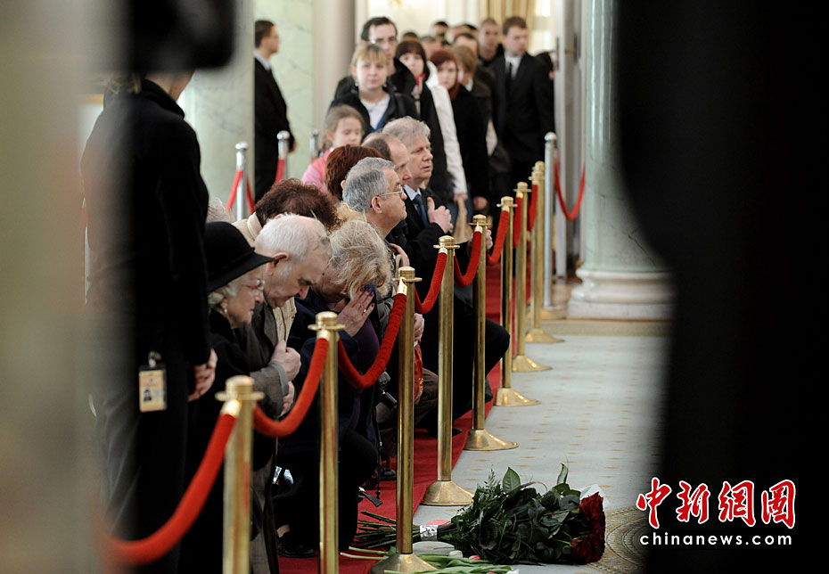 當(dāng)?shù)貢r(shí)間4月13日14時(shí),波蘭總統(tǒng)夫婦的遺體被安放在總統(tǒng)府最大的圓柱廳供民眾瞻仰和悼念?偨y(tǒng)卡欽斯基及其夫人的葬禮將于18日舉行。圖片來源:中國新聞網(wǎng)