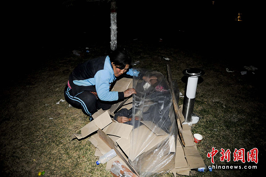 圖為4月15日凌晨,青海玉樹地震受災(zāi)民眾在露天睡覺,由于救災(zāi)物資匱乏有的民眾只得以塑料薄膜當(dāng)棉被御寒。中新社發(fā) 廖攀 攝