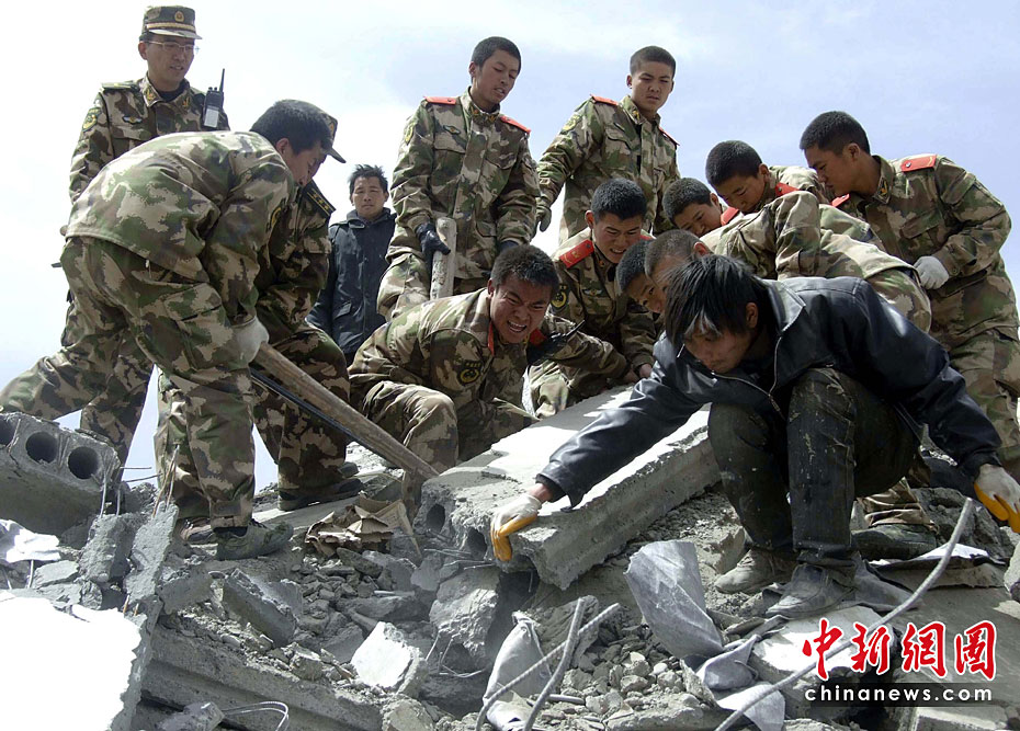 圖為4月14日,武警玉樹支隊的戰(zhàn)士和玉樹當?shù)孛癖姽餐仍焕У拿癖姟V行律绨l(fā) 于文群 攝