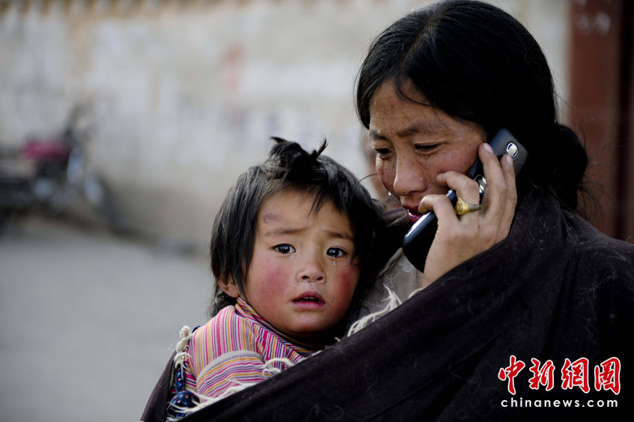 4月15日,青海玉樹縣體育場(chǎng)的地震災(zāi)民安置點(diǎn)內(nèi),一位母親在與親人通話時(shí)潸然淚下,懷里小女兒的腳傷還在等待醫(yī)治。中新社發(fā) 廖攀 攝