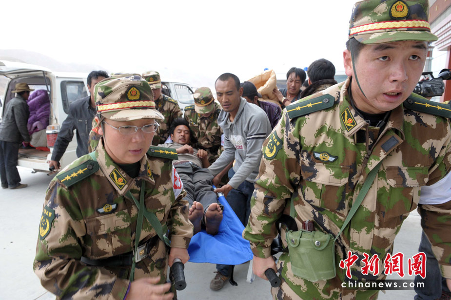 4月15日下午,云南邊防總隊(duì)醫(yī)療救援隊(duì)剛下飛機(jī)立即投入傷員轉(zhuǎn)移工作。圖為官兵們?cè)谟駱?shù)機(jī)場(chǎng)從救護(hù)車(chē)上抬下地震危重傷員,進(jìn)行轉(zhuǎn)移安置和治療。中新社發(fā) 陳文 攝