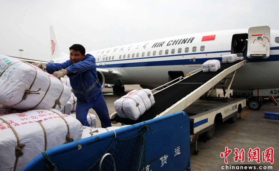 4月15日,重慶江北國際機場停機坪上,工人們緊張地將救援物資裝運上飛機準備起運青海地震災區(qū)。青海玉樹縣地震發(fā)生后,中共中央政治局委員、重慶市委書記薄熙來庚即作出重要批示,要求重慶全力以赴支援災區(qū),根據(jù)災區(qū)需求提供支援。中共重慶市委、市政府第一時間向青海省政府發(fā)去了慰問電,并支援災區(qū)300萬元和大批救援物資,首批救援物資于當日下去從重慶起飛空運至災區(qū)。中新社發(fā) 郭晉嘉 攝