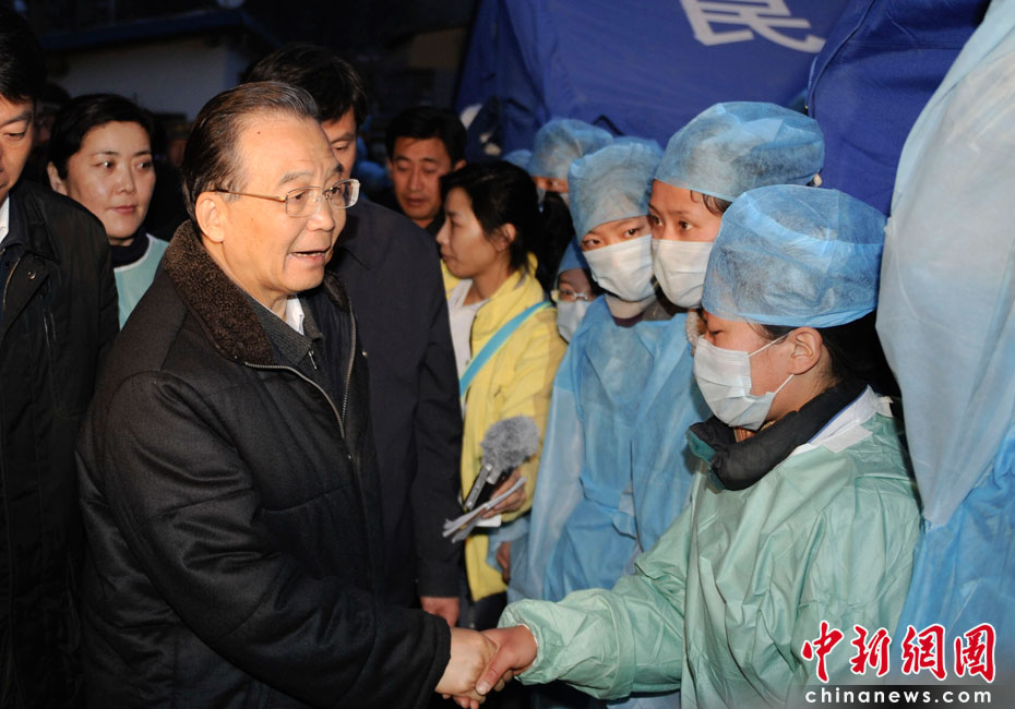 4月15日20時,中國國務院總理溫家寶來到青海省玉樹縣玉樹自治州醫(yī)院看望受災民眾和醫(yī)務人員。中新社發(fā) 廖攀 攝