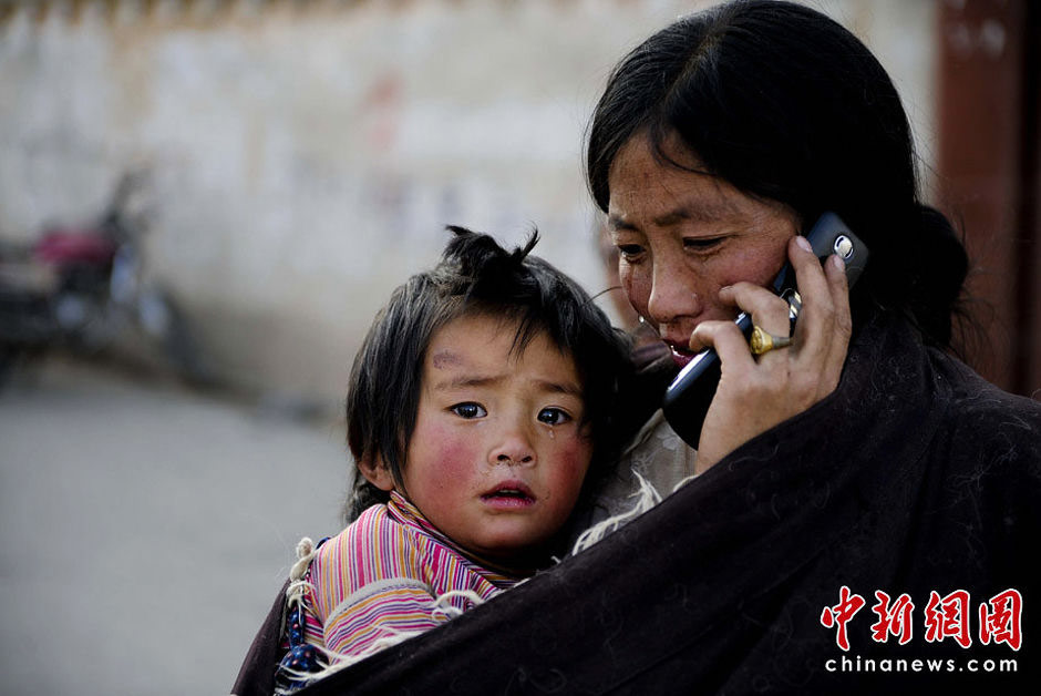 圖為4月15日,青海玉樹縣體育場的地震災(zāi)民安置點(diǎn)內(nèi),一位抱著小女兒的母親在與親人通話時(shí)潸然淚下。中新社發(fā) 廖攀 攝