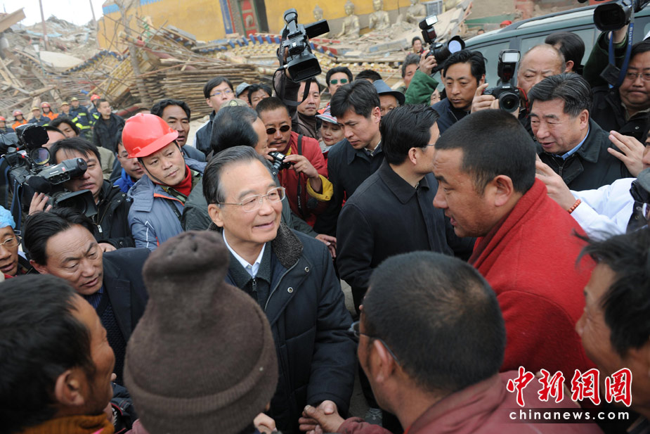 4月16日上午,中國(guó)國(guó)務(wù)院總理溫家寶來(lái)到距離玉樹(shù)縣城約10公里的禪古寺,看望受災(zāi)僧侶和民眾。溫家寶表示,只要有一線(xiàn)希望,就將盡最大努力救援,他還慰問(wèn)了正在現(xiàn)場(chǎng)實(shí)施挖掘救援的工作人員。中新社發(fā) 符永康 攝