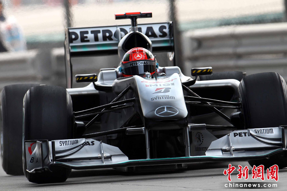 4月16日,2010國際汽聯(lián)F1世界錦標(biāo)賽上海站在上海國際賽車場開始車手第一、第二次練習(xí)賽。圖為代表梅賽德斯GP車隊(duì)出戰(zhàn)的老車王、德國車手舒馬赫重回上海賽道。 中新社記者 任晨鳴 攝