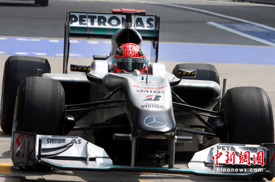 4月16日,2010國際汽聯(lián)F1世界錦標(biāo)賽上海站在上海國際賽車場開始車手第一、第二次練習(xí)賽。圖為代表梅賽德斯GP車隊出戰(zhàn)的老車王、德國車手舒馬赫重回上海賽道。 中新社記者 任晨鳴 攝