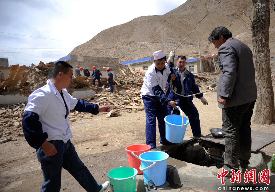 4月16日,青海玉樹民族綜合職業(yè)學(xué)校生活保障人員提取地下水飲用。中新社發(fā) 廖攀 攝