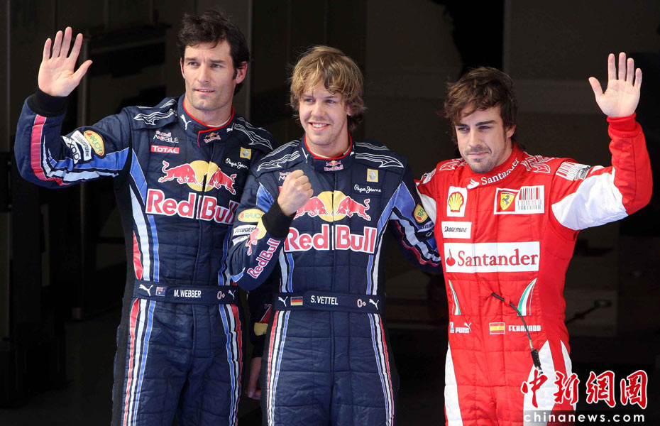4月17日下午,2010國(guó)際汽聯(lián)F1世界錦標(biāo)賽上海站在上海國(guó)際賽車場(chǎng)舉行排位賽,代表紅牛車隊(duì)出戰(zhàn)的德國(guó)車手維特爾(中)獲得桿位,隊(duì)友、澳大利亞車手韋伯(左)獲得第二名,法拉利車隊(duì)的西班牙車手阿隆索獲得第三名。中新社記者 任晨鳴 攝