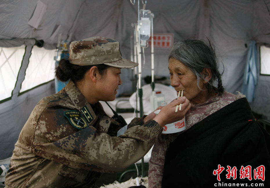 總后青藏兵站部抗震救災醫(yī)療隊目前在玉樹災區(qū)開展救治工作,已收治重癥傷病員48名,實施手術9例。醫(yī)療隊到達玉樹結古鎮(zhèn)后,迅速設立野戰(zhàn)醫(yī)院,展開救治工作。在得知西同路附近還有大批傷員急需救治后,又迅速派出救護車進行就診。圖為醫(yī)療人員精心護理傷員。中新社發(fā) 鄒小慶 攝