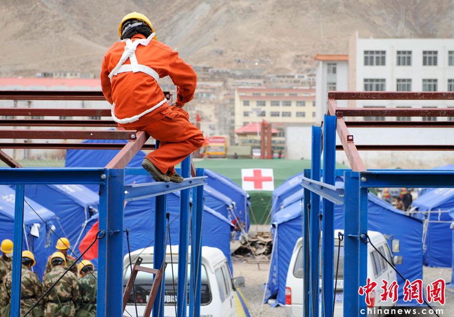 4月17日,青海玉樹(shù)體育場(chǎng)受災(zāi)民眾安置點(diǎn),工人們安裝臨時(shí)板房。中新社發(fā) 廖攀 攝