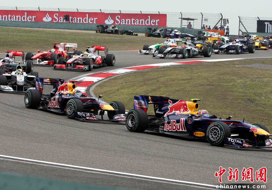 4月18日下午,2010國(guó)際汽聯(lián)F1世界錦標(biāo)賽上海站在上海國(guó)際賽車場(chǎng)舉行正式比賽,邁凱輪車隊(duì)的英國(guó)車手巴頓在雨中獲得冠軍、隊(duì)友、英國(guó)車手漢密爾頓獲得亞軍,梅賽德斯GP車隊(duì)的德國(guó)車手羅斯伯格獲得季軍。圖為比賽發(fā)車后眾位車手通過(guò)一號(hào)彎。中新社記者 任晨鳴 攝