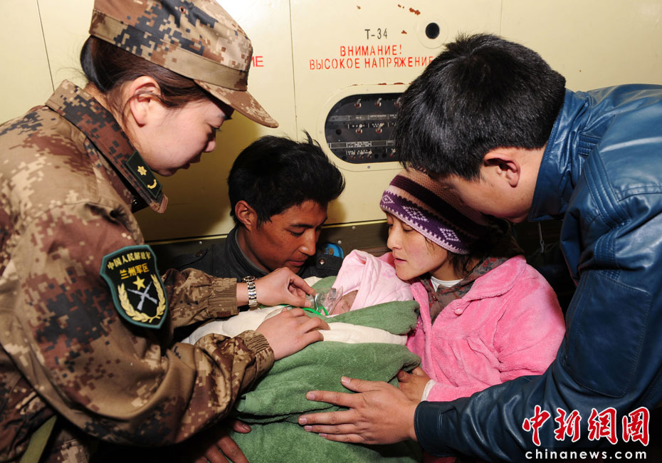 4月18日上午9點10分,剛剛到達玉樹機場正在卸下救災(zāi)物資的廣空運輸航空兵某師劉軍機組,聽說有名早產(chǎn)兒急需轉(zhuǎn)送蘭州軍區(qū)總醫(yī)院救治,僅用15分鐘準備,9點25分飛機提前起飛。懷孕8個多月藏族婦女尼瑪拉毛,由于地震驚嚇導致早產(chǎn)。當日凌晨4點轉(zhuǎn)院途中,在蘭州軍區(qū)323醫(yī)院婦產(chǎn)醫(yī)生王小特、盧小娟的幫助下,產(chǎn)下一男嬰。由于早產(chǎn)、產(chǎn)程長,嬰兒嚴重缺氧,發(fā)生紫疳,為了盡快挽救嬰兒生命,準備轉(zhuǎn)往蘭州軍區(qū)總醫(yī)院。圖為蘭州軍區(qū)323醫(yī)院救護隊員隨機救護。中新社發(fā) 沈玲 攝