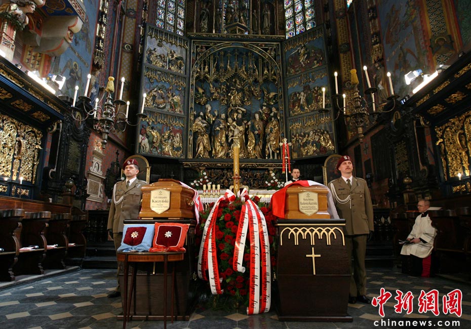 當?shù)貢r間4月18日,卡欽斯基夫婦的葬禮在波蘭南部城市克拉科夫舉行。波蘭總統(tǒng)卡欽斯基及其夫人乘坐的專機10日在俄羅斯斯摩棱斯克失事,機上人員全部遇難。圖片來源:中國新聞網(wǎng)