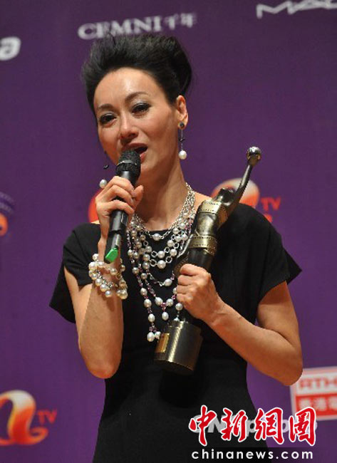 4月18日晚,“第二十九屆香港電影金像獎(jiǎng)”頒獎(jiǎng)典禮在香港文化中心大劇院隆重舉行,影星惠英紅憑演出電影“心魔”奪得最佳女主角獎(jiǎng)項(xiàng)。圖為惠英紅手持獎(jiǎng)座向媒體暢談感受。 中新社發(fā) 鄧慶樂 攝