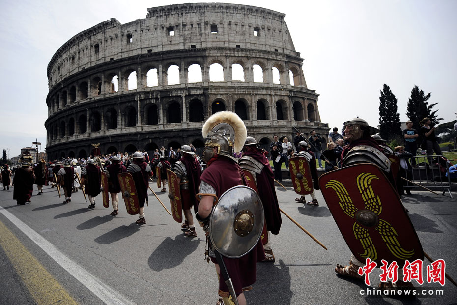 4月18日,意大利羅馬,男子打扮成武士在圓形競(jìng)技場(chǎng)附近參加游行,慶祝羅馬建城2763周年。圖片來(lái)源:中國(guó)新聞網(wǎng)